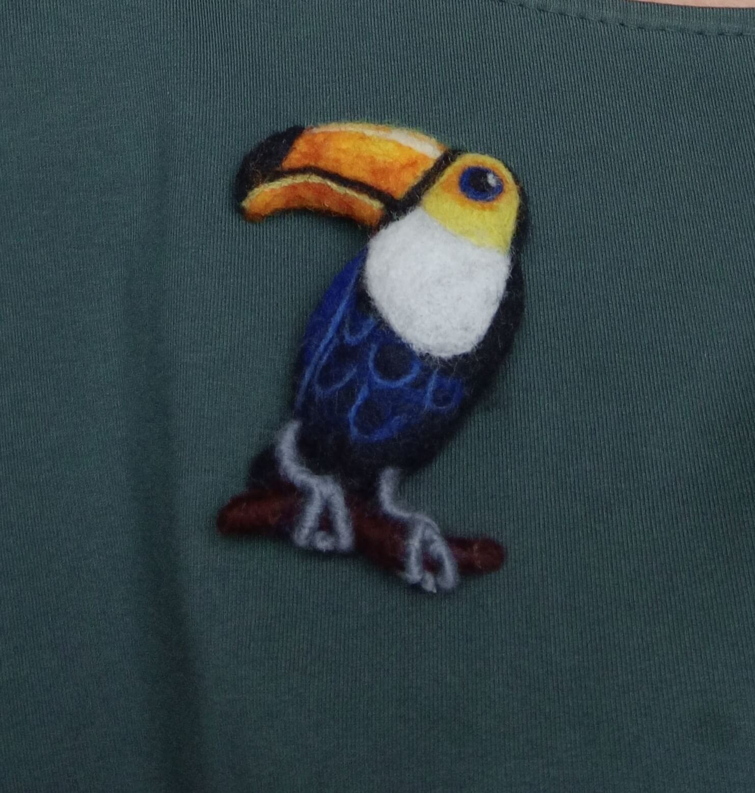 Большое спасибо за курс "Тукан"! Я начала валять недавно, и этот курс стал для меня новой ступенькой. Очень интересно было поработать с тонировкой, наложением шерсти разных цветов и изготовлением проволочных лапок, обнимающих веточку. Спасибо большое, Виктория! Следующим шагом будет зимородок: это уже более сложная работа, посмотрим, как я справлюсь:) А вот какой у меня получился тукан.